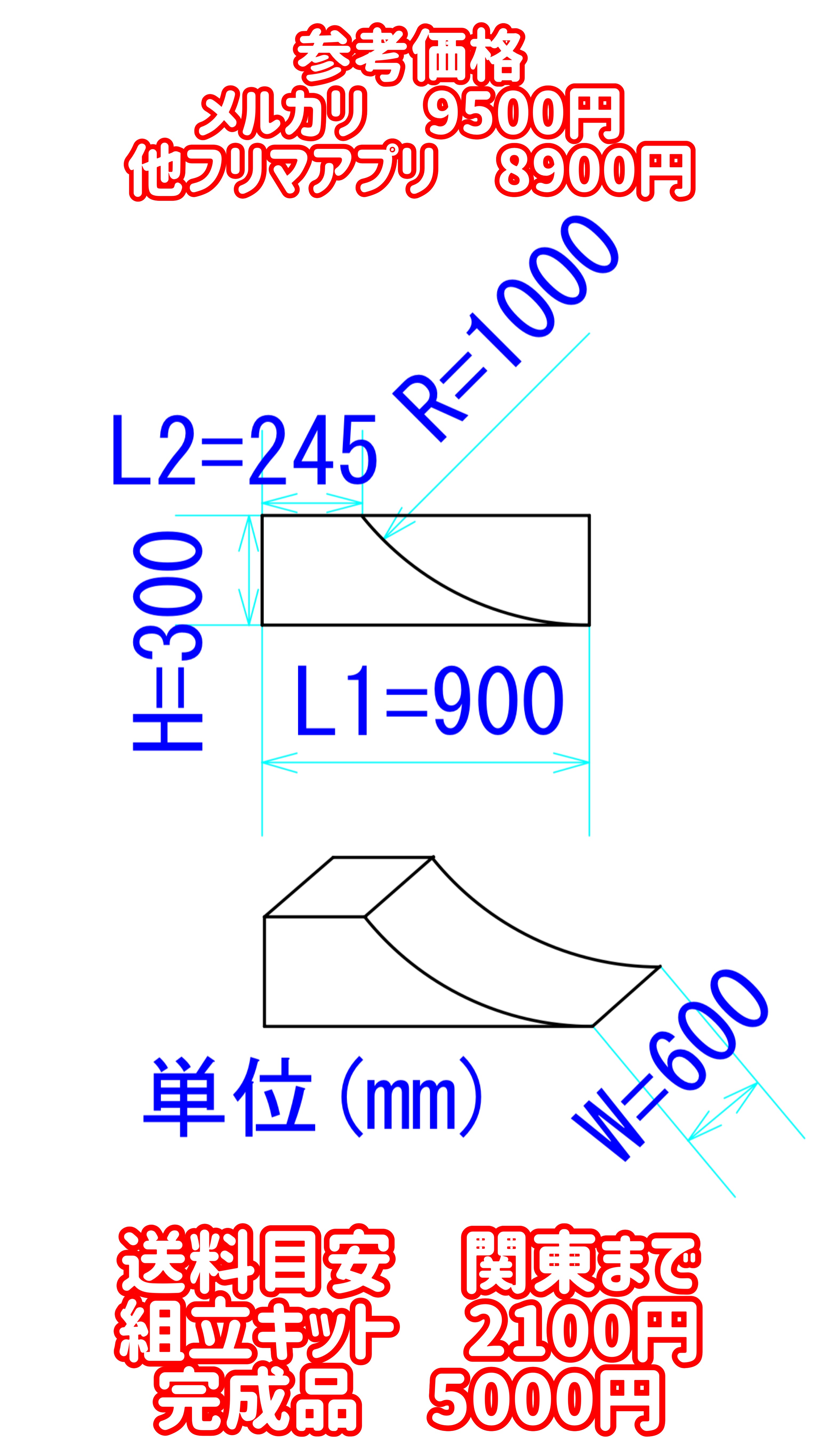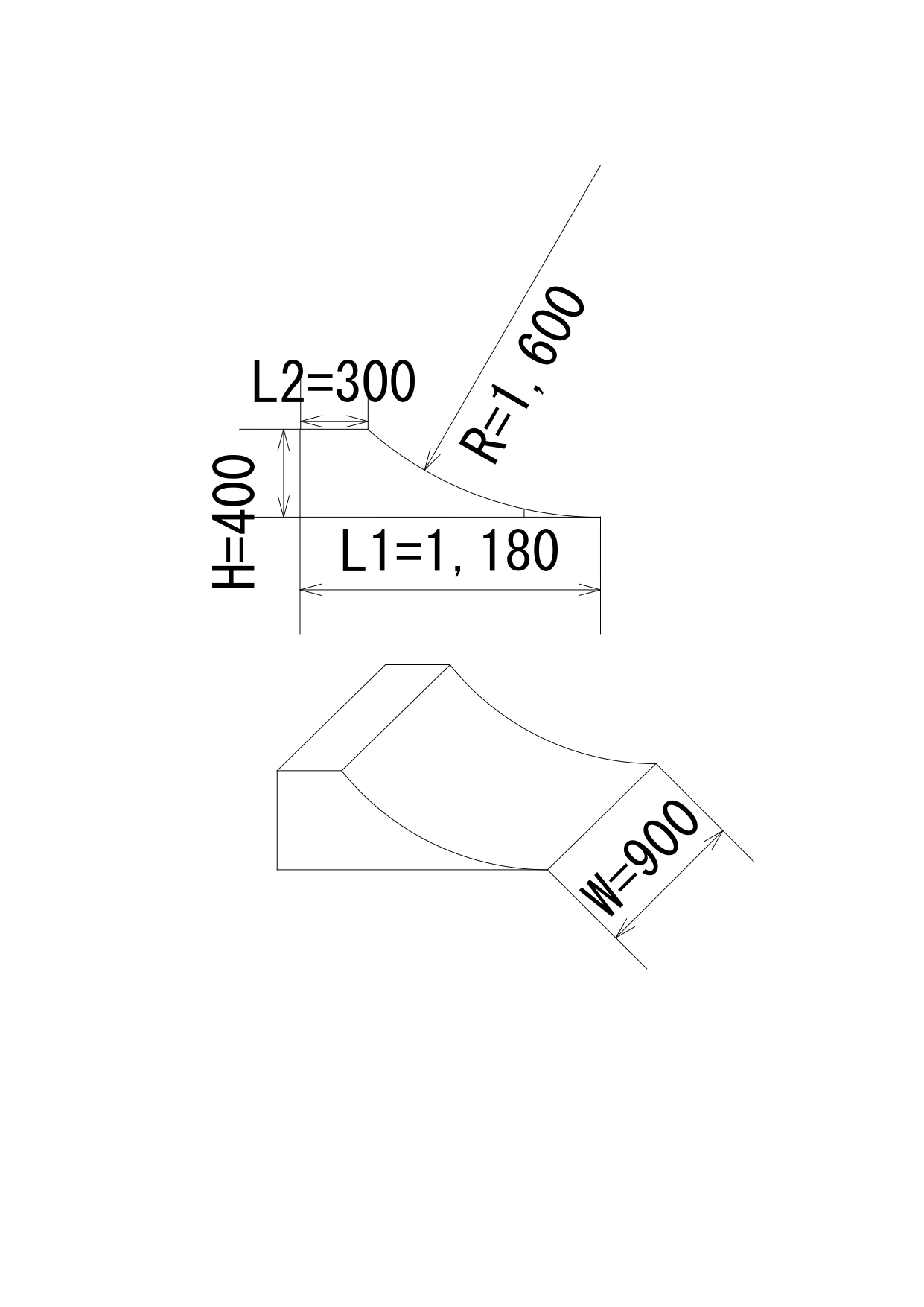商品サイズ:H400 W900 R1600 L1 1180 L2 300 (mm)