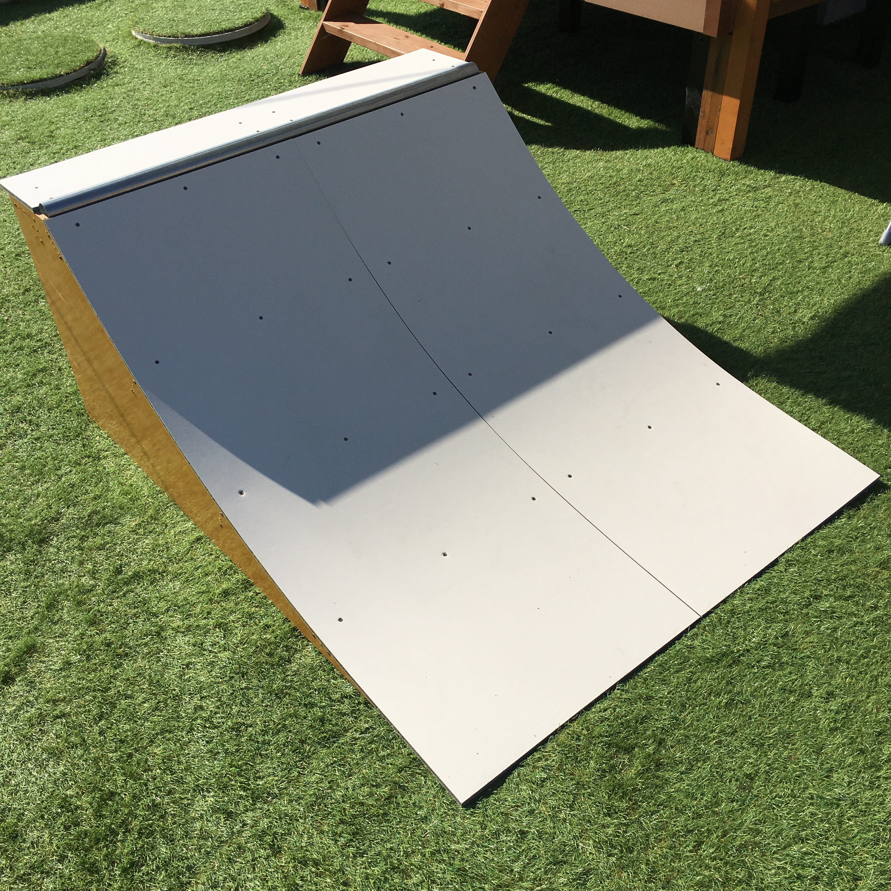 滑走面にNFボードという高価(ベニヤ板の4倍)で耐摩耗性、耐水性に優れた板を採用しております。これにより、屋外でも劣化しにくく、よく見るベニヤが水を吸ってふやけて剥がれる、みたいな事はありません。多くのショップ、パークで採用されております。